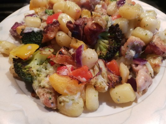 Verdeel de broccoli, kip, krieltjes, paprika en rode ui over de ovenschaal, bestrooi met zout en peper en schenk de pestoroom eroverheen. Bedek met de mozzarella. Bak 30 minuten in de oven, of tot dat de kaas goudbruin is en de krieltjes zacht zijn.