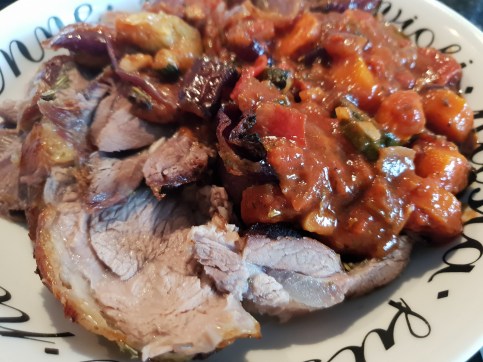 Maak intussen je tomatensaus. Bak de knoflook en de gehakte peterseliestelen een minuut in een pan in een scheutje olijfolie, doe er dan de tomaten, een mespunt zout en peper, een flinke scheut azijn, de gedroogde Spaanse peper en de ansjovisfilets bij. Houd de saus een half uur tegen de kook aan. Controleer het vlees en de aubergines na 20 minuten. Draai de lamsbout om en schep de groente om en zorg dat die niet te droog wordt – giet er een scheut water bij als dat nodig is. Zorg voor ze, dan worden ze fantastisch.