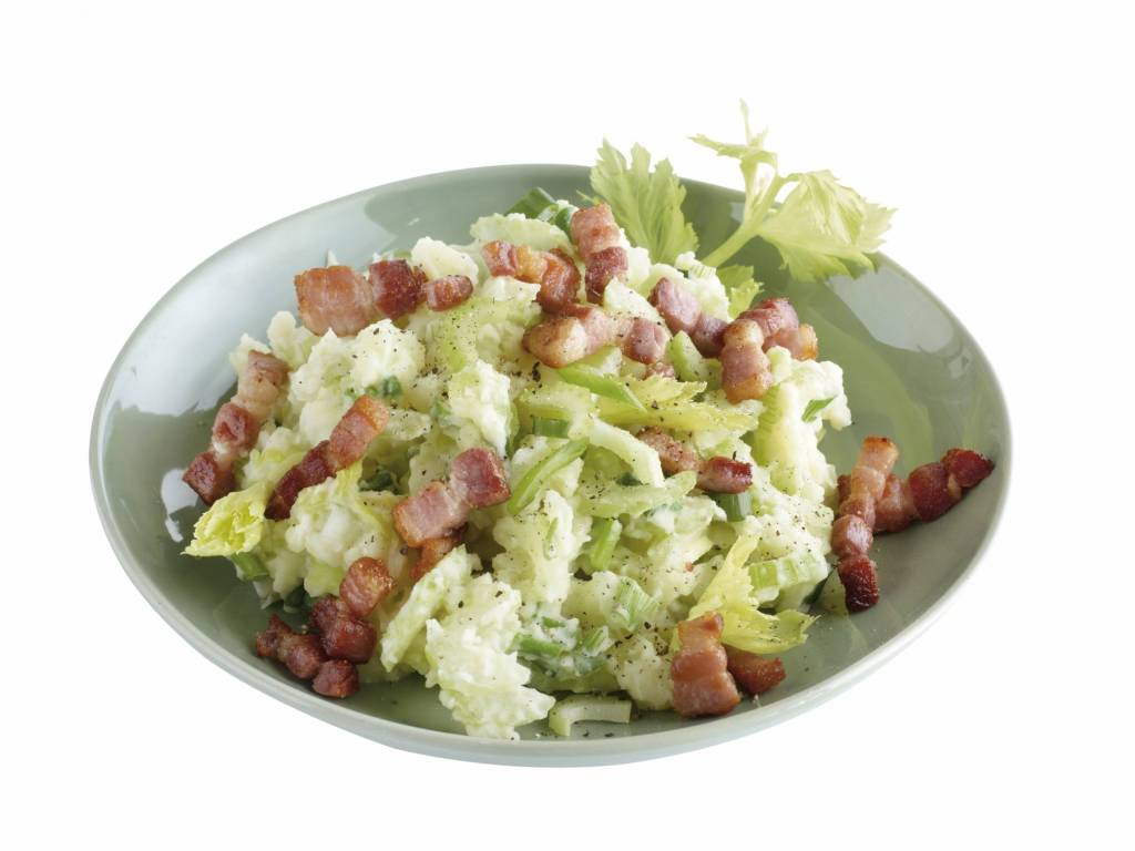 Bak de spekjes in een droge hete koekenpan krokant en schep ze eruit. Bak vervolgens de bacon in het spekvet krokant. Kook intussen de aardappels gaar en doe de laatste 2 minuten de bleekselderij erbij. Giet de aardappels (als ze gaar zijn) en selderij af. Meng de spekblokjes, bosui, crème fraiche en stamp tot een grove stamppot. Voeg peper en zout naar smaak toe of gebruik het spekvet.