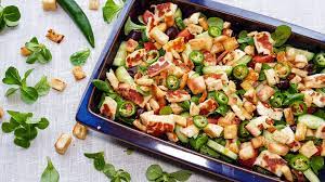 - Snijd de halloumi in dikke plakken en bak deze in een koekenpan zonder olie of boter. Bak de halloumi aan beide kanten lichtbruin. Snijd de gebakken halloumi in stukjes. Verwarm wat olijfolie in dezelfde koekenpan. Snijd de pitabroodjes in stukjes en bak de stukjes pita in de olijfolie met wat zout en peper. Zet de croutons en halloumi opzij totdat je deze nodig hebt.