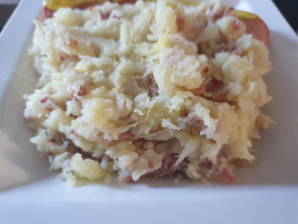 Schil de aardappelen en kook deze in 15 minuutjes gaar met een beetje zout (naar smaak). Verwarm de zuurkool met een beetje vocht in een pannetje en maak dit op een klein vuurtje warm. Ondertussen bakje de spekjes. Als de aardappelen uit elkaar vallen giet je ze af en doe je het beetje melk en de spekjes, inclusief het bakvet, bij de aardappelen. Stamp dit tot een mooie puree (het mag wat grover zijn als je dat lekker vindt). Doe vervolgens de zuurkool erbij en meng dit goed door elkaar. Dien op met een lekkere rookworst.