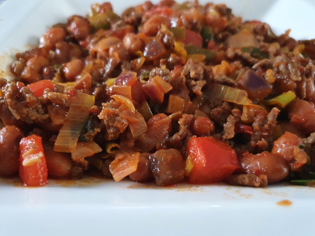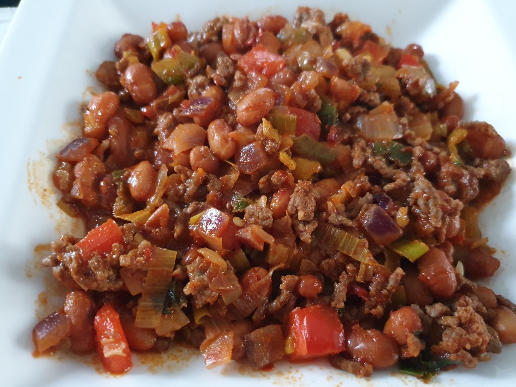 Laat de bruine bonen uitlekken. Bak het gehakt rul en doe, de fijn gesneden, uien erbij en laat die rustig glazig worden. Voeg de overige groenten toe en bak die op, een wat hoger vuur, mee. Voeg de kruiden en de tomaten en paprikapuree toe. Bak die 1 minuut mee en doe het water erbij. Doe de deksel erop en laat alles, op een laag vuurtje, 5 minuten warm worden. Doe de bruine bonen erbij en laat alles goed warm worden.