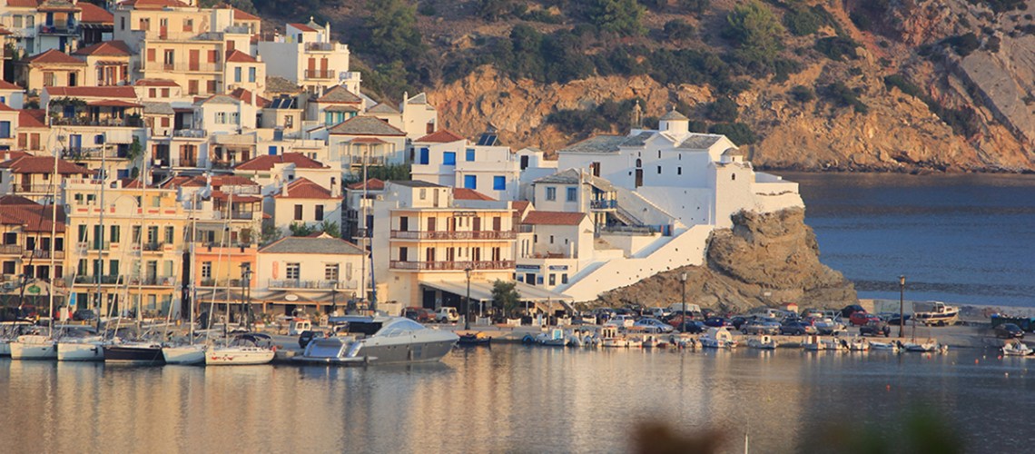 Gedurende de zomer rijden er bussen een uursdienst en maken bij alle stranden stops. De mooiste stranden zijn Stafilos, Agnondas, Limonari, Panormos (onze favoriet), Mili, Neo klima, Kastanibeach (voormalig Mama Mia strand) enz. Het eiland is ook zeer bekend geworden door het opnemen van de film Mama Mia met Meryl Streep en Pierce Brosnan. Een bezoek aan de Mama Mia rock kan niet uitblijven en is een must. Zeker het bezoek aan het beroemde kerkje.